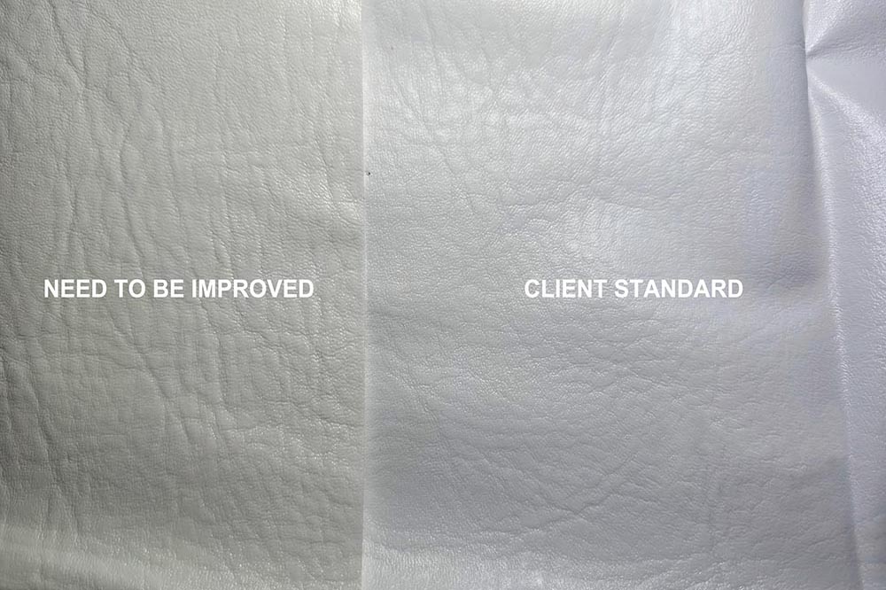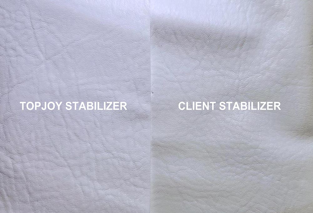 However, when using their original stabilizer for mass production, the client consistently faced a thorny issue: The initial whiteness of the produced white artificial leather products was insufficient, appearing slightly yellowish to the naked eye. For white high-gloss leather, this subtle color difference directly affects the terminal premium of the finished product. Consequently, the client approached TopJoy Chemical, hoping we could provide a more professional customized solution.
